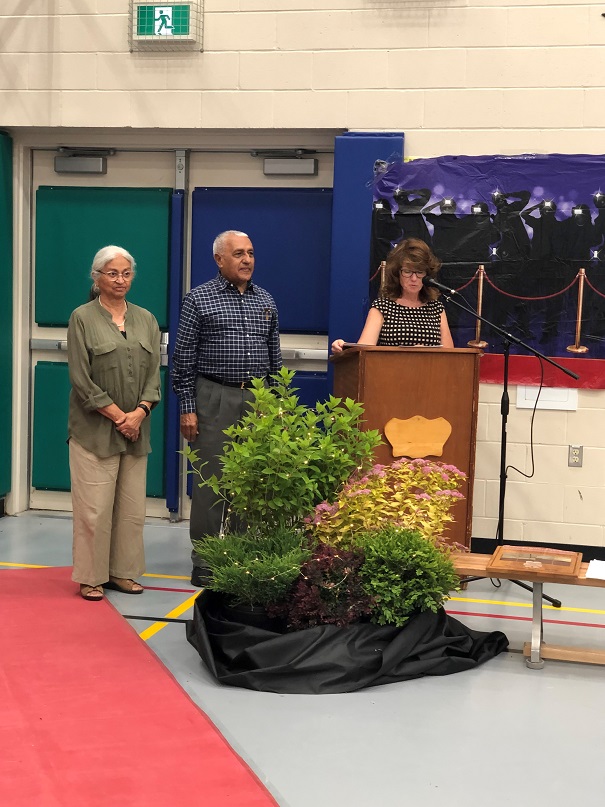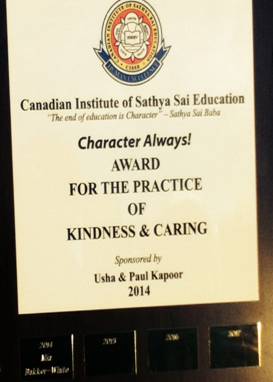 Retired public school teachers, Usha and Mohinder Paul, provided volunteer service teaching Sathya Sai Education in Human Values at two schools in this school district for over seven years. In appreciation of their dedicated and selfless service in the cause of character education at Eamers Corners, Principal Kieran Kennedy kindly accepted the plaque in the name of the Canadian Institute of Sathya Sai Education. The Award will be presented annually.